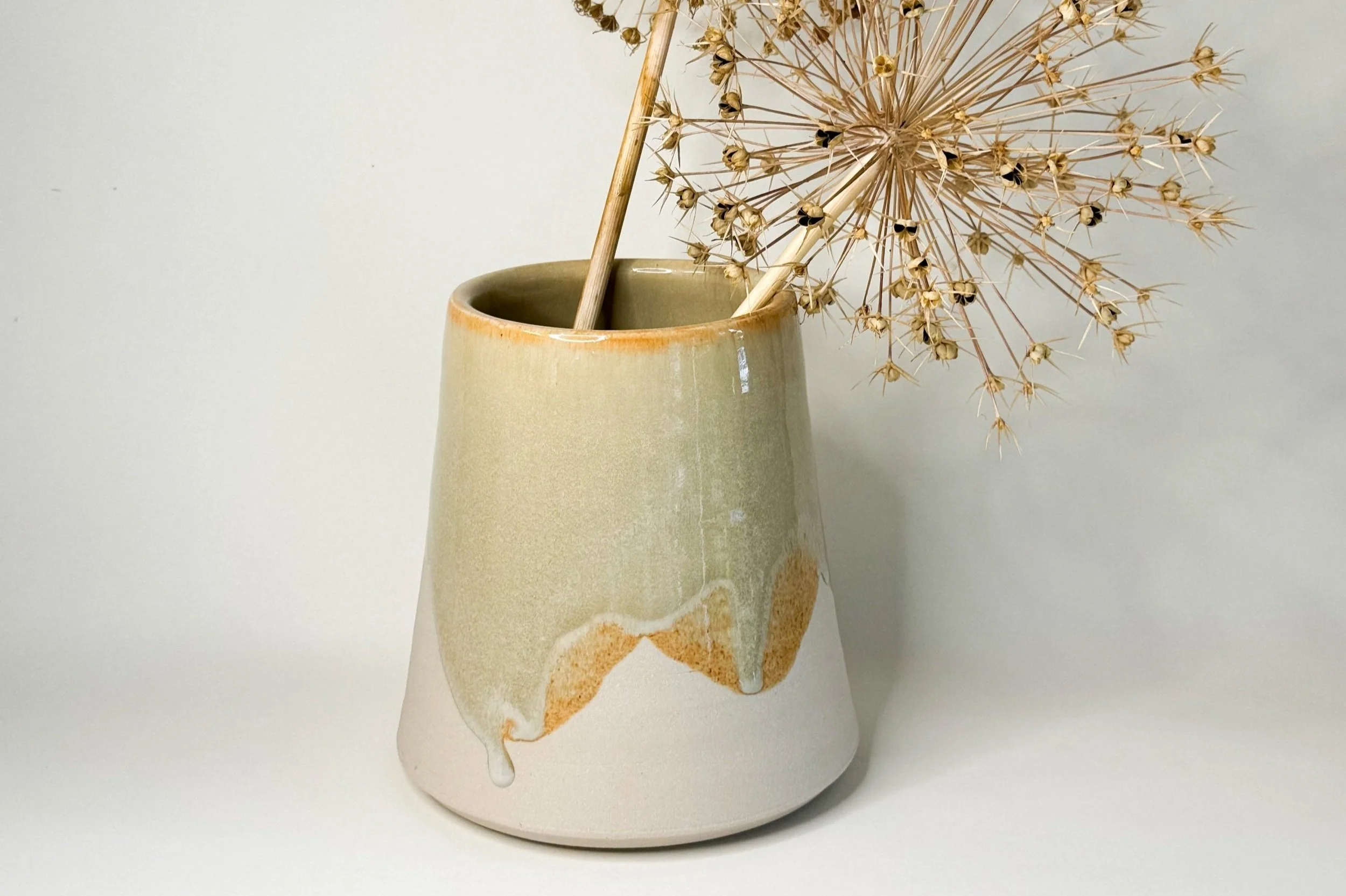 The majority of our pieces use a dripping glaze technique that we love! It guarantees that no two pieces are the same and is always exciting to unpack the kiln and see what effects have taken place each firing.